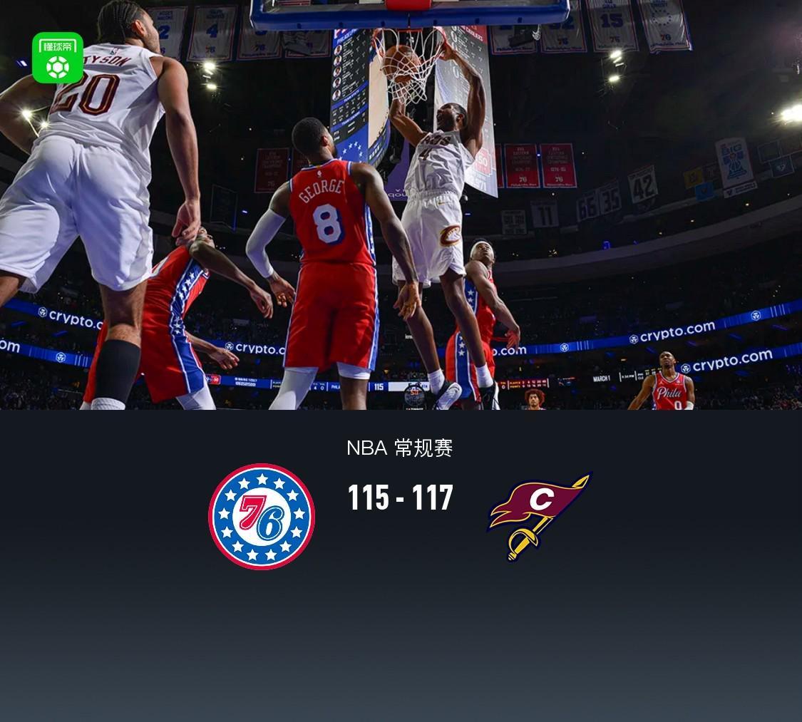 费城76人恩比德33分5板3助,马克西22分5板9助;克利夫兰骑士杰伦-泰森39分5板3助,亨特16分3板4助