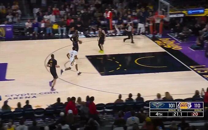 今天湖人逆转鹈鹕,三连胜到手,在比赛还剩20秒时,湖人前场3打1,老詹在禁区放弃进攻。