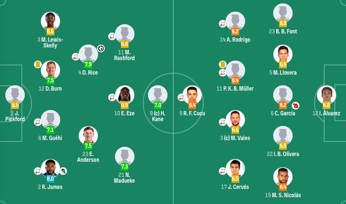 英格兰首发:1-皮克福德、3-斯凯利、6-格伊(76'5-孔萨)、12-丹-伯恩、2-里斯-詹姆斯(68'16-利夫拉门托)、4-赖斯(68'15-罗杰斯)、10-埃泽(78'17-吉布斯-怀特)、23-埃利奥特-安德森、11-拉什福德(68'7-戈登)、9-凯恩、21-马杜埃凯